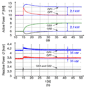 图7描述了逆变器的有功功率。最初,每个电网形成方式的逆变器都提供10kW功率,电网支持方式的逆变器都提供6kW功率。于是,两个电网形成方式的逆变器和两个电网支持方式的逆变器平均分摊负载功率。15s时,4.2kW的负载阶跃功率被加到第一个电网上。随着负载改变,所有的逆变器都马上做出了反应,功率的产生和消耗被重新分配。