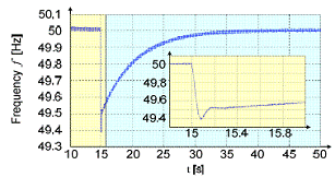 电力系统的频率如图8所示。由于一次和二次控制都影响电网频率,但是影响是在不同的时间尺度,快速控制器的反应如放大窗口所示。