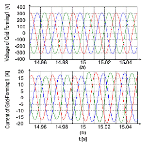 第一个电网形成方式的逆变器在连接点处的电压和电流如图9所示。逆变器电压几乎不受干扰,与此同时,只有电流去适应相关负载情况。