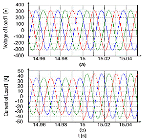 图10 (a) t=15s时加入阶跃负载的负载三相电压 (b) t=15s时加入阶跃负载的负载三相电流