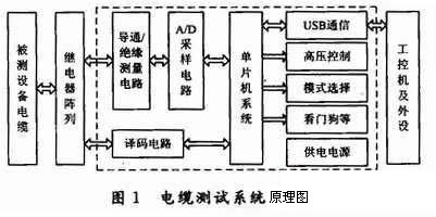 电缆测试系统主要由工控机系统,单片机系统和继电器阵列三部分构成。其中工控机负责人机交互和数据处理,单片机系统控制硬件电路完成相应动作,继电器阵列负责响应译码电路的请求将外部电缆接入测试系统。单片机和工控机通过USB进行通信。如图1所示。