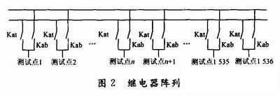 继电器阵列由3168个继电器实现了1536个测试点之间的导通/绝缘测试和继电器组之间的隔离。1 536个测试点分布在12块单板上面,每块单板上面有128个测试点,单板内又分为16行,每行8列,即12×16×8=1 536。每一个测试点由两个继电器控制,分别是输入继电器(Kat)和输出继电器(Kab)。每块单板对应外部的一个128芯的航空插头,负责和被测产品的连接。其原理如图2所示。