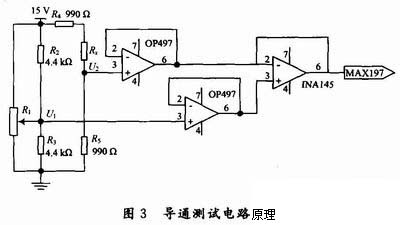 由于导通电阻很小,一般为欧姆级,容易受到外界干扰的影响,惠斯登电桥的两臂同时对电源的微小变化做出反应,将输出信号送入差分放大器,从而消除了共模干扰,可以提高测试的准确性。其原理如图3所示。
