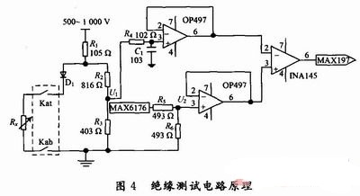 对于绝缘测试电路而言,由于输入测试电压为500~1 000 V,对干扰不太敏感,所以绝缘测试电路采用相对简单的电阻分压法来实现。
