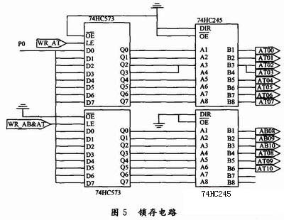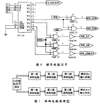 继电器译码电路的作用是在单片机的控制下将1 536个测试点中的某两个测试点接入相应的测试电路。比如译码电路选中测试点1的输入继电器Kat和测试点2的输出继电器Kab,外部的被测电缆通过这两个测试点接入相应的测试电路,从而实现了导通或者绝缘测试。为了实现这样的功能译码电路可以分为地址锁存电路,输入继电器译码电路和输出继电器译码电路。以输入地址锁存电路为例,其原理如图5,图6所示。