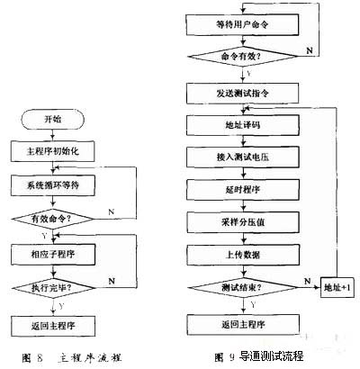 绝缘测试部分的工作流程和导通测试类似,但是需要特别注意的是在执行绝缘测试命令时,系统首先会对测试区间内的点进行一次导通测试,并记录导通的通道号,这样在工控机向单片机发送地址指令时会自动跳过这些通道,从而保证操作人员和被测产品的安全,防止高压短路可能引起的灾难性后果。