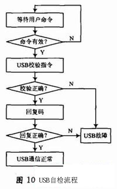 为了保证设备本身的工作正常,电缆测试系统提供自检功能。自检流程分为两部分,第一部分对USB通道进行自检,USB自检流程如图10所示。系统上电后,工控机发送校验指令,单片机判断校验码是否正确,在校验码正确的情况下,按照协议返回复码,工控机判断回复码正确的情况下,USB通信建立正常。第二部分是对继电器阵列进行自检,其流程与导通测试类似。以测试点1和测试点2为例,首先,闭合测试点1的输入继电器,采样测试电压,如果系统判断为断开,则可以说明测试点1的输出继电器没有常闭,反之则说明为常闭故障。把测试点1的输入继电器更换为输出继电器,采用同样的方法可以判断出测试点1的输入继电器是否为常闭故障。其次,分别打开测试点1的输入和输出继电器,如果系统判断为导通,在第一步的基础上就可以说明两个继电器均正常;如果系统判断为断开,则两个继电器中至少有一个为??收稀W詈?,在外部端口上接入自检插头,分别选择测试点1的输入继电器和测试点2的输出继电器,如果系统判断为导通,则可以说明内部继电器和单板到端口的引线正常,反之则说明继电器到测试端的引线出现问题。