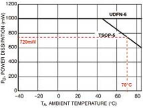 环境温度低于70℃时,TSOP-5和µDFN-6封装都可以耗散720mW的功率,因此能满足这一应用的最坏情况要求。然而,µDFN-6封装的功率耗散能力更强,与采用TSOP-5封装的同等转换器设计相比,能够承受的温度更高。