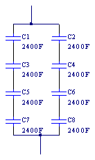 超级电容以4个串联,2组并联的方式构成。每个超级电容的能量输出为