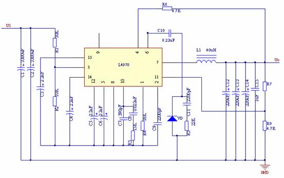 L4970A芯片的输出电压设定为10.8V,其输出电阻R7由下式确定: