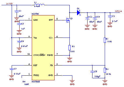MAX668为固定频率,电流反馈型PWM控制器,内部采用双极型CMOS多输入比较器,可同时处理输出误差信号、电流检测信号和斜率补偿信号,由于省去了传统的误差放大器,从而抑制了由误差放大产生的相移。MAX668能够驱动多种类型的N沟道MOSFET,这里选择的是FDS6680。由于芯片工作在100 kHz 以上的高频状态,所以二极管D1应选取可高速关断的肖基特二极管,本文选择的是MBR5340T3。