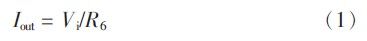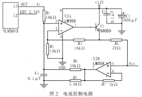 电流控制电路采用数模转换器芯片TLV5613加上V/I转换电路构成稳定电流源,可通过单片机程序控制输出所需要的电流给测量回路供电以满足系统测试对电流的要求。在极性测试环节可给出合适的电流值,便于系统测量二极管电压值并据此判断二极管的好坏及极性;在特性测试环节可根据设定电流值增大或减小回路电流,使其与设定值一致;在伏安特性曲线绘制环节可给出由小到大逐渐增大的电流值便于系统采样绘图。
