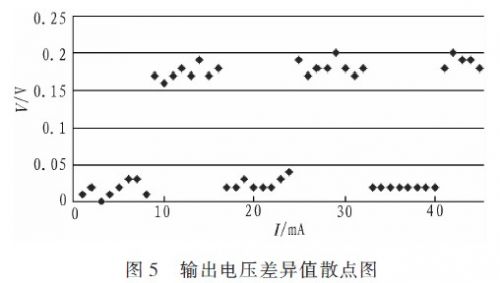 在软硬件设计全部完成后的测试阶段,发现DA输出的电压值在某些点上与理论值不符,具有较大差异并呈现一定的周期性(且都是输出值比理论值小)。通过初步分析,认为是DA的控制字写入在某些点上不正确,于是将硬件电路上AD的模拟电压输入引脚断开并直接接在DA电压输出脚,并编写了测试小程序,将0~5V每次递增0.02V对应的控制字写入DA,用AD测其输出电压值并将结果通过串口返回PC,然后将电压理论值与实测值的差值全部导入Excel,然后在Excel中插入这些值的散点图,散点图如图5所示,0~250mA电流值分别对应0~5V的电压值(图中截取了0~45mA这一段),纵坐标为输出电压理论值与实际值的差异值。