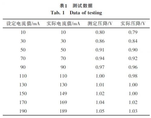 被测二极管采用1N4118,用2个优利德数字万用表UT33D作为测量仪器对系统进行测试,其中一个以毫安档(量程200mA)与被测二极管串联,另一个以直流电压档(量程5V)与被测二极管并联,在不同的设定电流值下测量二极管的实际电流和电压,测试结果如表1。