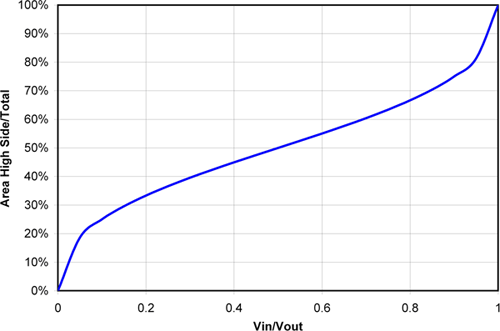 通过图1,我们知道 50% 转换比率时出现最佳传导损耗极值。但是,在其他转换比率条件下,可以将损耗降至这一水平以下。附录 1 给出了进行这种优化的数学计算方法,而图 2 显示了其计算结果。即使在极低的转换比率条件下,FET 芯片面积的很大一部分都应该用于高侧 FET。高转换比率时同样如此;应该有很大一部分面积用于低侧。这些结果是对这一问题的初步研究,其并未包括如高侧和低侧FET之间的各种具体电阻值,开关速度的影响,或者对这种芯片面积进行封装相关的成本和电阻等诸多方面。但是,它为确定 FET 之间的电阻比提供了一个良好的开端,并且应会在FET选择方面实现更好的整体折中。