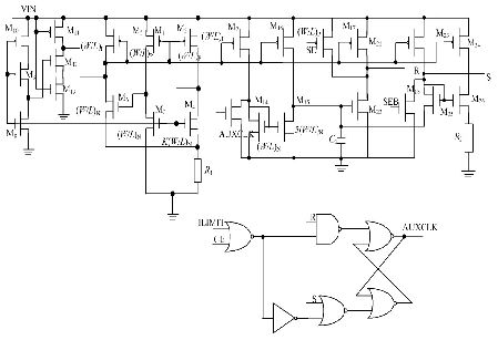 SE 为辅助振荡器切换信号, SEB 为SE 的反信号。当V DD低于1. 9 V 时, SE 为高电平, M17 , M18 都截止, 不影响R, S 触发器的翻转, 辅助振荡器工作, 开关S1 断开, S2 闭合; 当VDD 高于1. 9 V 时, SE 为低电平, 辅助振荡器关断, 开关S1 闭合, S2 断开, M17 , M18 都导通, R=1, S= 0, AU XCLK 被锁定为高电平, 既减小了功耗, 也避免了辅助振荡器关断之后R, S 端出现不确定状态。