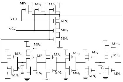 本文所设计的主振荡器采用如图2 所示的环形振荡器结构。VC1, VC2 分别为过压?;さ缏?, PWM 比较器的输出信号, MP10和MP11 为带隙基准提供的镜像电流, 合理的控制镜像电流和电容C1 , C2 的大小, 即能够使主振荡器在1. 9~ 8 V 的V DD区间输出350 kHz 左右较稳定的振荡频率。