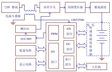 该方案中开关电源的最大输出功率为2.6KW,交流输入范围为l70V-270V,充电器电路主要包括主充电电路和单片机控制电路两部分,整个电路的工作过程为:220v单相交流电经过全桥整流由电容进行滤波.得到约300v左右的直流电.经过由4只IGBT构成的逆变桥,得到高频交流电,经高频变压器耦合到副边.再经过整流管D6,D7整流。最后经过电感L3和电容C7滤波后得到稳定的直流输出。由于采用智能充电,根据不同的电池每个阶段充电电压和充电电流都不同。所以使用cygnal公司的C8051040F单片机作为充电过程控制设备,充电时单片机检测充电电池的充电电流,充电电压,电池温度,防止电路过压和过流。电池温度过高,还可以通过检测电池电压电流值来决定是否在切换到下一个的充电阶段。同时通过单片机给出每一阶段的充电的电压值或是电流值,与采样所得的对应电压电流值相比较。通过移相控制芯片uCC3895改变PWM值来改变功率管的导通时间.达到在不同电池不同阶段得到不同稳定的输出值的目的。