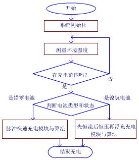 然后,设置A/D转换参数和通道,检测电池的端电压。将检测数据同理论经验值比较,判断电池的类别以及是否连接正确。对端电压低的电池,采用短时间的脉动电流充电,这样有利于激活电池内的化学反应物质。部分恢复受损的电池单元。对端电压在标称范围内的电池选择相应的充电控制模块和算法,对端电压不在标称范围内的电池.软件自动将其剔除。