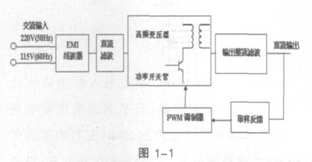 接入交流电网(50Hz ,220V AC 或者115VAC)经EMI 防电磁干扰电源线滤波器,直接整流滤波变成直流,再经变换器将直流电压(275V 或172V)变换为数十KHz 或数百KHz的高频方波或准方波电压控制功率开关管,经高频率变压器隔离、降压(或升压),再经高频整流滤波后输出直流电压,经取样、比较、放大控制PWM 调制器驱动功率开关管的占空比。从而可以得到稳定的输出电压。