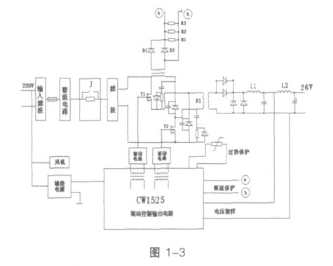 以上是开关电源基本原理和控制方式的介绍,结合我们实际工作中固态发射机开关电源控制方式以及理论理解,使我对大功率开关电源原理、整体控制方式有了进一步的认识。现以5kW- 14CH 大功率合放式全固态电视发射机直流26V/100A 正激开关电源变换器的工作原理和维修方法来简单介绍一下,如图1- 3 所示: