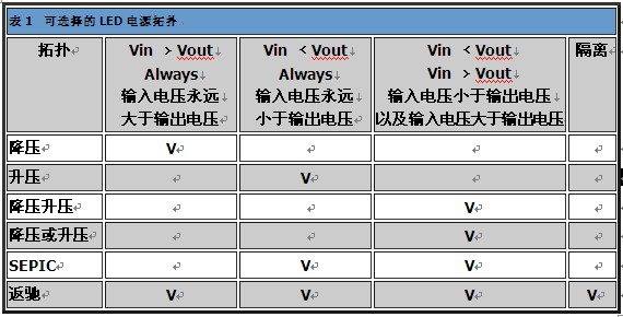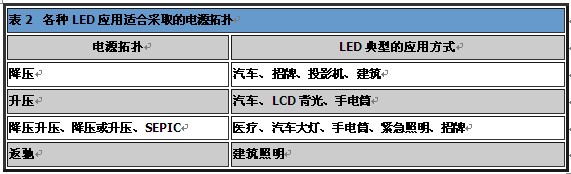 如同表2所示,LED已广泛运用于各领域,因此需要许多种类的电源拓扑,支持LED的应用。一般而言,必须考虑输入电压、输出电压及对隔离的需求,以做出适当选择。