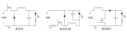 图1也显示替代的降压稳压器(Buck #2)。在此电路中,MOSFET的驱动与接地有关,大幅降低了驱动电路的需求。本电路侦测LED电流的方法为监控FET电流,或是与LED串联的电流侦测电阻。如果采用后者,则须要使用位准移位电路,将此信息送至接地电源,并将简单的设计复杂化。同样显示于图1中的升压转换器,则是在输出电压永远大于输入时使用。这种拓扑设计容易,因为MOSFET的驱动与接地有关,而电流侦测电阻也是属于接地引用类型。此电路的缺点是在短路时,无法限制通过电感的电流,可以使用保险丝或电路断路器,作为故障?;ぷ爸?。此外,还有一些较复杂的拓扑可提供这类保护。