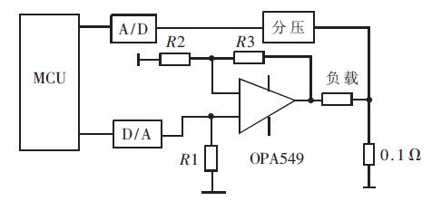 在该电源系统中, 主要为负载提供大电流, 采用PID 控制算法控制负载的发光强度。输入为单片机经DAC输出的控制电压, 一路为比例放大电路, 如图1 所示增益G=1+R3/R2.电流型DAC 通过R1 转换成电压, 控制OPA549 .输出电流经采样电阻转换为采样电压, 送入A/D 转换器反馈至单片机进行偏差值补偿。