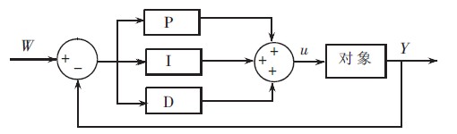 PID 控制原理如图2 所示。PID 控制是一种线性调节器, 它把设定值W 与实际输出值相减, 得到控制偏差e .偏差值e 经比例、积分、微分后通过线性组合构成控制量U, 对对象进行控制。其中比例调节器起到基础调节作用, 主要对控制系统的灵敏度和控制速度有影响。积分调节器可以自动调节控制量, 消除稳态误差,使系统趋于稳定。微分调节器可以减小超调, 克服振荡, 同时加快系统的稳定速度, 缩短调整时间, 从而改善系统的动态性能。