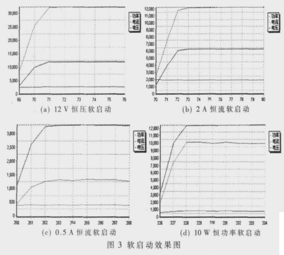 从图3 的软启动效果图可以看出, 在恒定电压、电流、功率的模式下工作时, 系统开机过程超调量很小, 有效地控制了启动过程, 防止了启动过程产生过大的扰动电压, 产生过大的功率, 有效地?;ち烁涸亍?br />