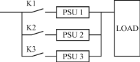 以某个输出电流为100A的系统为例来说明冗余结构运行的好处,这里只讨论1+1,2+1,3+1三种工作方式,如图2所示。各电源??榈墓ぷ髑榭鲇蒏n的闭合情况决定。