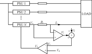 Ri为任一并联模块输出电流Io的采样电阻,经电流放大产生电流反馈电压信号Vi,Vf为输出电压反馈,Vr为Vi与Vf的和,Vg为控制基准电压(5V),Ve为误差电压。当某一模块输出电流Io偏大时,电压与电流反馈合成信号Vr=Vi+Vf增大,与Vg进行比较后,使Ve减小,Ve反馈回电源模块的控制部分,使该??榈氖涑龅缪笽o下降,则Io减小,即Vo=f(Io)外特性下调。每个模块各自调整自己的输出电流,就可以实现各??榈牟⒘鳌?nbsp;
