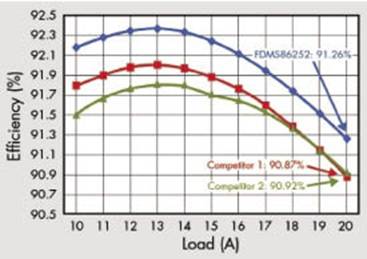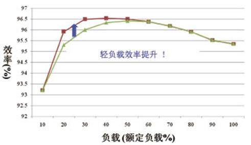 针对于服务器应用和通信应用的高性能电源,在设计过程中有以下三个指标尤为重要:一、如何提高系统的功率密度,二、如何提高系统轻载下的效率,三、如何实现长系统寿命下的高可靠性。图片所示是在原系统基础上改用飞兆半导体中等电压Power Trench MOSFET后在轻载25%状态下效率有明显的提高,大约1%左右。