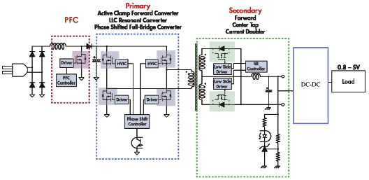 这里我们首先以AC-DC同步整流应用为例。在通讯电源的应用中它的主功率部分主要由功率校正电路、原边的电源转换电路、副边的整流电路组成,我们可以很清楚的看到,在图中有非常多的功率器件,系统的效率也就由这些功率器件的工作效率以及本身的性能优劣决定。