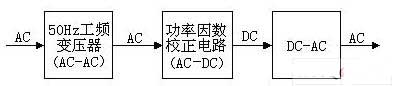 1. 三级构成方案Ⅰ。其结构如图3所示。第一级是50Hz工频变压器,用来实现电气隔离功能,从而保证电源设备的安全性,免受来自高压馈电线的危险。第二级是功率因数校正电路,用来强迫线电流跟随线电压,使线电流正弦化,提高功率因数,减少谐波含量,其输出是400V左右的高压直流。第三级是DC-AC模块,用来实现逆变功能,即通过控制逆变电路的工作频率和输出时间比例,使逆变器的输出电压或电流的频率和幅值按照人们的意愿或设备工作的要求来灵活地变化。