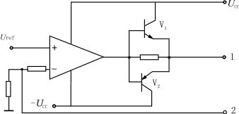 JTU—100型电子负载的原理图如图2所示,它最大可以吸收10A的电流,图中V1、V2为调整管,Uref为可调基准源,1、2为输出端,调节Uref的大小,不管负载如何变化,都可以在1、2端得到设定的电压。
