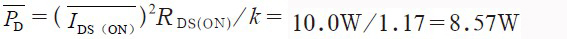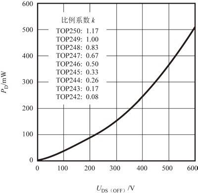 (3)若考虑到还有关断损耗,从图3中可查出PD=510mW=0.51W(UDS(OFF)=600V)。假定占空比为50%,在计算平均功耗时应将关断损耗除以2。因此PD=9.72W+0.51W/2=9.975W,该结果就与10.0W非常接近。