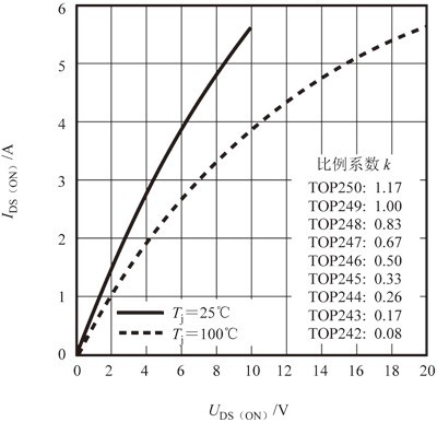 下面对开关电源散热器的设计要点作进一步分析。以TOPSwitch-GX(TOP242~TOP250)系列单片开关电源为例,当MOSFET导通时漏-源极导通电流(I DS(ON) )与漏-源极导通电压(U DS(ON) )的归一化曲线如图2所示。