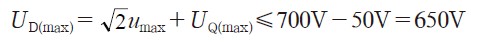 为安全起见,U D ( max)至少应比漏-源极击穿电压7 00V留出5 0V的余量。这其中还考虑到P6KE200具有0.108%/℃的温度系数,当环境温度T A=25℃时,U B=200V;当T A=100℃时,UB=200V×[(1+0.108)%/℃]×100℃=221.6V,可升高21.6V。