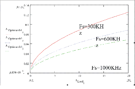 图4:在同步整流器MOSFET不同开关频率上的最优化裸片面积是负载电流的函数。