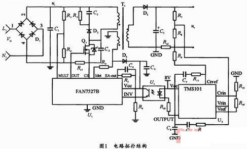 在能源?;推虮渑侍庠嚼丛窖现氐慕裉欤谀苡牖繁R殉晌缁峤沟阋樘?。LED因其高效、节能、环保、寿命长、色彩丰富、体积小、耐闪烁、可靠性高、调控方便等诸多优点等特点受到人们的广泛关注,被认为是21世纪最有前途的照明光源。传统的白炽灯效率低、耗电高;荧光灯省电,但使用寿命短、易碎,废弃物存在汞污染;高强度气体放电灯存在效率低、耗电高、寿命短、电磁辐射危害等缺点;若能以LED照明取代目前的低效率、高耗能的传统照明,无疑能缓解当前越来越紧迫的能源短缺和环境恶化问题。由于LED自身的伏安特性及温度特性,使得LED对电流的敏感度要高于对电压的敏感度,故不能由传统的电源直接给LED供电。因此,要用LED作照明光源首先就要解决电源驱动的问题。传统的LED驱动电源虽然可以实现LED亮度调节,但是不能实现功率因数校正,输入功率因数比较低,谐波比较大。为了使LED驱动电源的输入电流谐波满足要求,必须加功率因数校正。本文介绍一种单级PFC反激式LED电源,该电源所用器件少,损耗低,具有较高的的功率因数和效率。