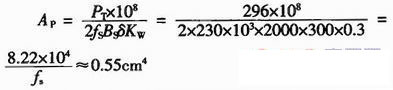 变压器的实际输出能力AP=Ae×Aw=0.55cm4,磁芯满足设计要求。