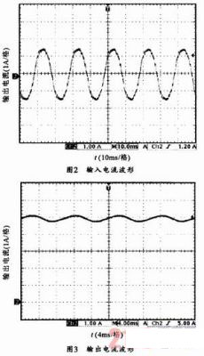 图3所示为输入220V,输出满载时的输出电流波形。纹波电流峰峰值120mA,输出电流中叠加有2倍市电供电频率的纹波电流。