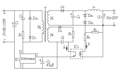 第五步,计算变压器的原边匝数,原边使用的经径.计算原边匝数的时候,要选定一个磁芯的振幅B,即这个磁芯的磁感应强度的变化区间,因为加上方波电压后,这个磁感应强度是变化的,正是因为变化,所以其才有了变压的作用,NP=VS*TON/SJ*B,这几个参数分别是原边匝数,,最小输入电压,导通时间,磁芯的横节面积和磁芯振幅,一般取B的值是0.1到0.2之间,取得越小,变压器的铁损就越小,但相应变压器的体积会大些.这个公式来源于法拉弟电磁感应定律,这个定律是说,在一个铁心中,当磁通变化的时候,其会产生一个感应电压,这个感应电压=磁通的变化量/时间T再乘以匝数比,把磁通变化量换成磁感应强度的变化量乘以其面积就可以推出上式来,简单吧.我的这个NP=90*4.7微秒/32平方毫米*0.15,得到88匝0.15是我选取的了值.算了匝数,再确定线径,一般来说电流越大,线越热,所以需要的导线就越粗,,需要的线径由有效值来确定,而不是平均值.上面已经算得了有效值,所以就来选线,我用0.25的线就可以了,用0.25的线,其面积是0.049平方毫米,电流是0.2安,所以其电流密度是4.08,可以,一般选定电流密度是4到10安第平方毫米.记住这一点,这很重要.若是电流很大,最好采用两股或是两股以上的线并绕,因为高频电流有趋效应,这样可以比较好.