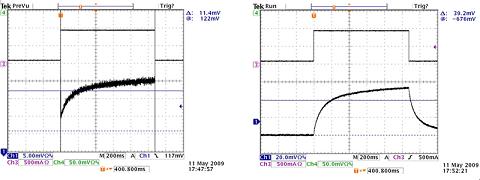 因为电流有些轻微依赖MOSFET的导通电阻,所以有必要在电流接近目标闪光电流时测量 PFET电阻。使用大测试电流的问题是它们可能导致器件发热??朔宋侍獾姆椒ㄊ墙凉獬笔奔渖柚梦畹?32ms,并在示波器上测量PFET的电压降。在+25℃到+125℃的情况下,使用1.2A闪光电流,结果显示的斜率大约为 0.42mΩ/℃ 。要注意的一个事情是PFET通过VOUT引脚供电,因此VOUT=5V时,其导通电阻会低于VOUT=3.9V时的电阻值。