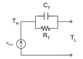 该模拟可以深入进行,以描述器件的另一个热属性,称之为热容。正如将热阻模拟为电阻,可以将热容(CT,单位为J/℃)模拟为电容。将热容与热阻并联获得热阻抗(ZT)。图1所示为传导传热的简化RC模型。能源被模型化为电流源,热阻抗被模型化为CT与RT并联。