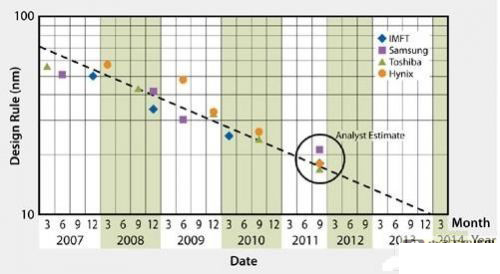 图1:NAND闪存技术的制造工艺几何尺寸变化趋势。