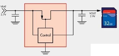 对于低速工作的小容量SD卡,耗电量常常小于100mA。假设锂离子电池的额定工作电压为3.7V,且存储器的电源轨相当高,则线性调节器就成为SD存储器的电源选择。不过,选定的线性调节器必须能以低压降(LDO)方式工作,因为锂离子电池的有效电压范围在3.2至4.2V之间。