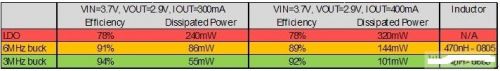 表1: LDO与 6MHz降压转换器和3MHz降压转换器的电源效率与功耗对比。