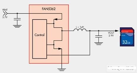 图4:FAN5362降压转换器实现2.9V SD卡的供电电路。